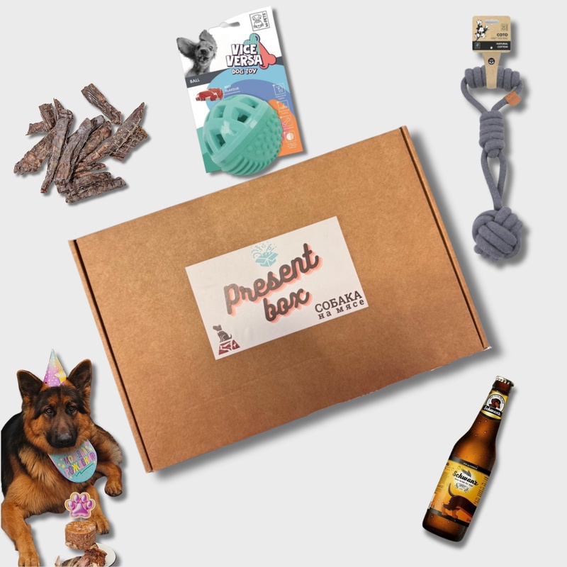 Состав: Пиво для собак,картонный праздничный набор для фотосессии,сушеная селезенка,мяч с запахом говядины,перетяжка мяч с петлей